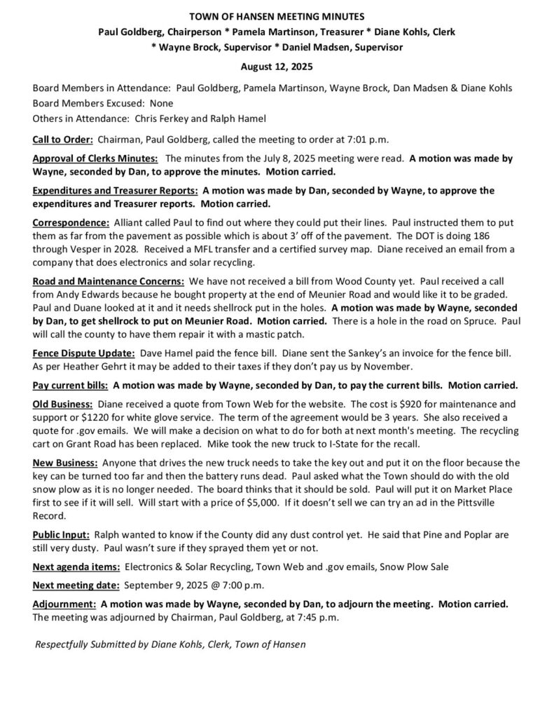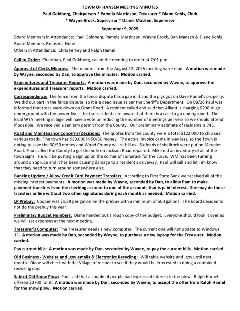 Correspondence: The fence from the fence dispute has a gap in it and the pigs got on Dave Hamel’s property. We did our part in the fence dispute, so it is a dead issue as per the Sheriff’s Department. On 08/26 Paul was informed that trees were down on Grant Road. A resident called and said that Alliant is charging $200 to go underground with the power lines. Just so residents are aware that there is a cost to go underground. The local WTA meeting in Sigel will have a vote on reducing the number of meetings per year so we should attend if possible. We received a sanitary permit from the County. Our preliminary estimate of residents is 743.