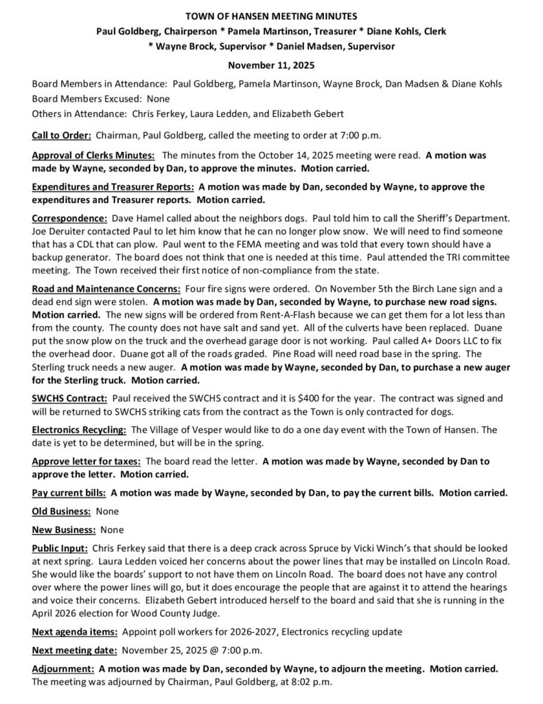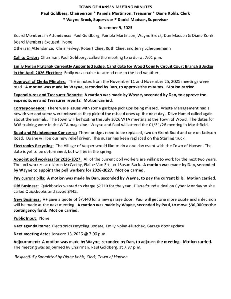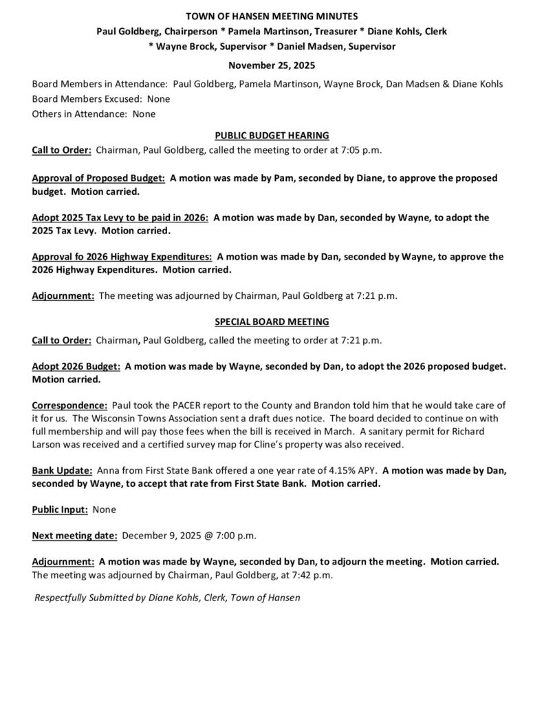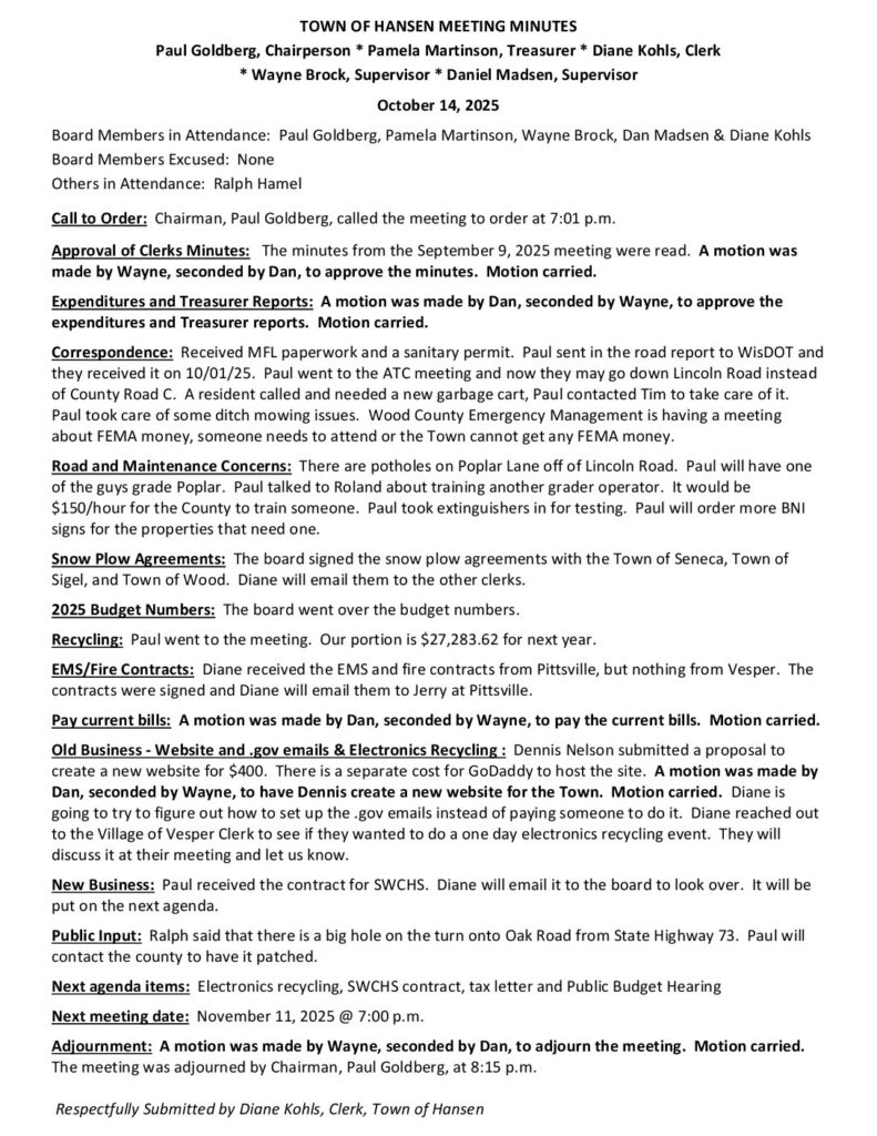 Respectfully Submitted by Diane Kohls, Clerk, Town of Hansen