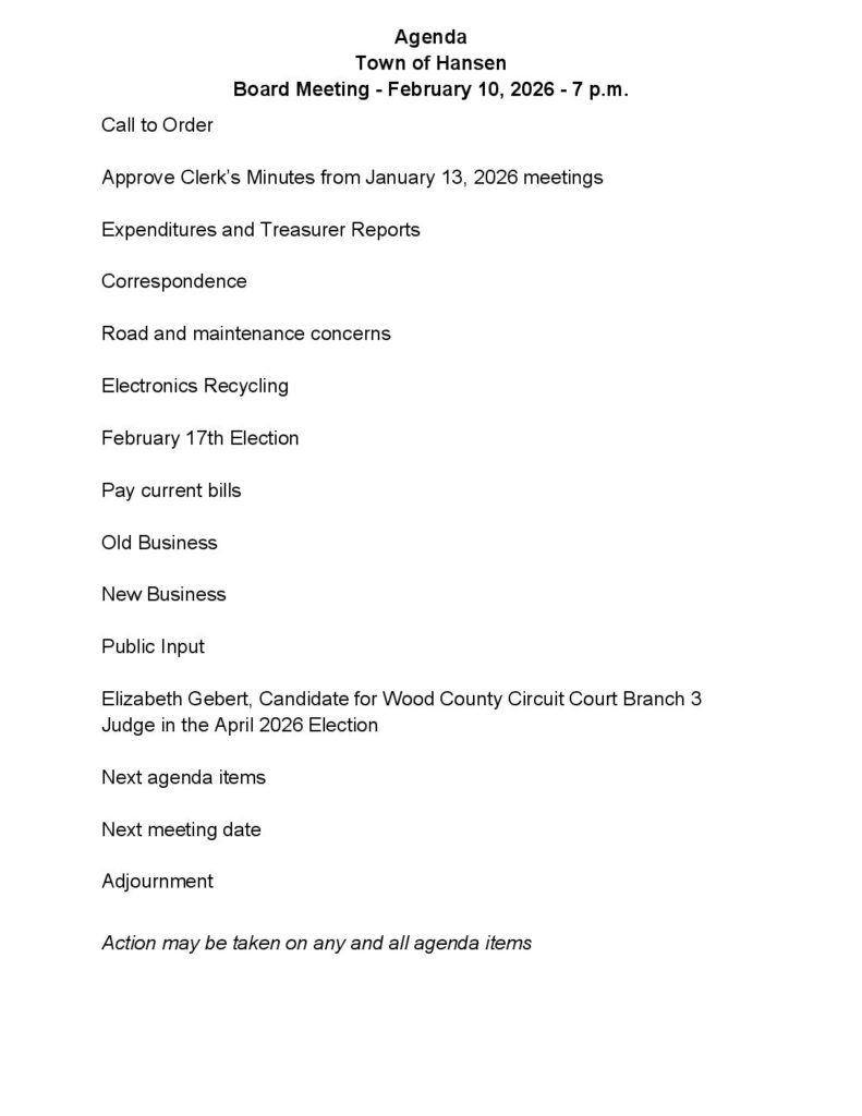 New Business: There was discussion on the old dump. One of the board members said that somewhere it says it is open to the public. It is not open to the public. Paul will get no trespassing signs and they will put them up at the dump. The City of Wisconsin Rapids sent the annual compost agreement. Paul signed it and Diane will email it back to the City. Annual passes for 2026 will be $70 for our residents. They can purchase them from the Town Clerk.