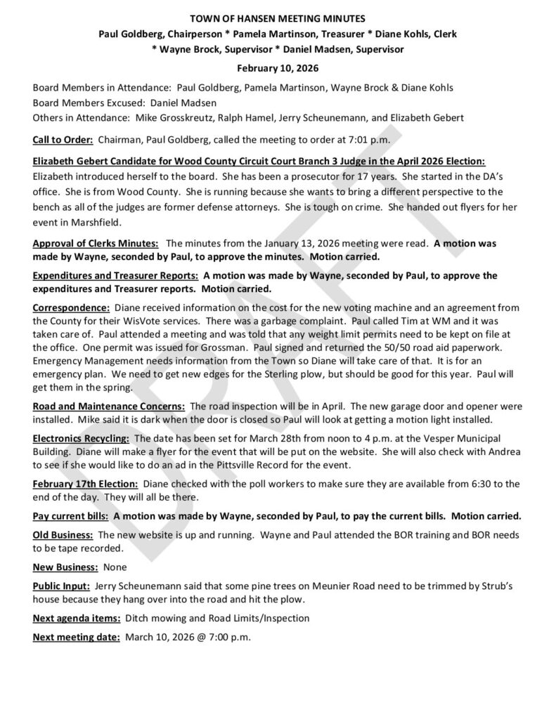 Old Business – Website and .gov emails & Electronics Recycling : Will table website and .gov until next month. Diane will check with the Village of Vesper to see if they would be interested in doing a combined recycling day.
