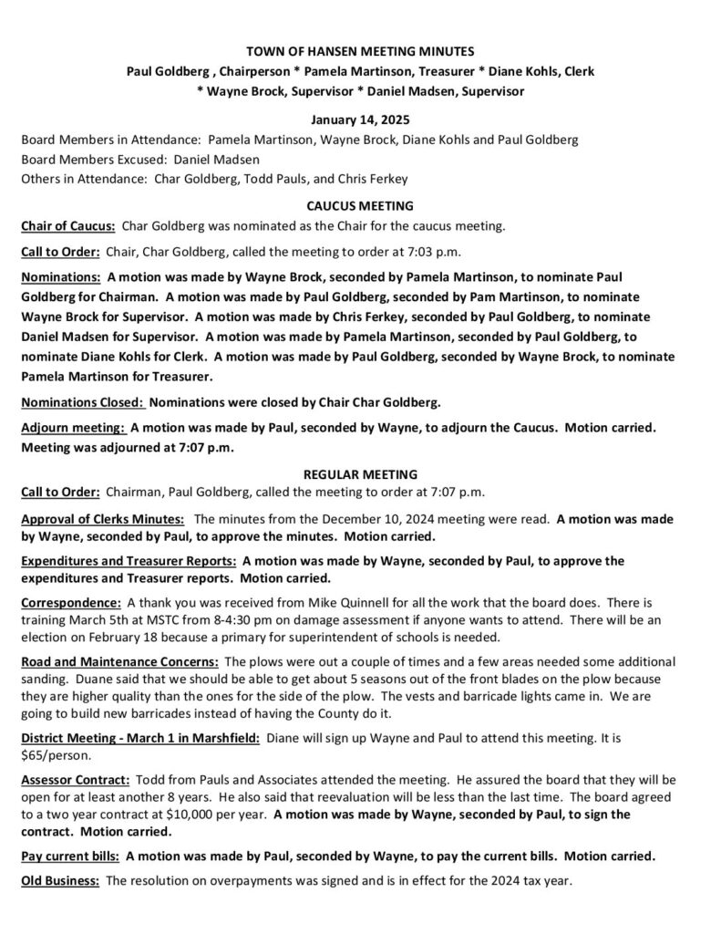 TOWN OF HANSEN MEETING MINUTES