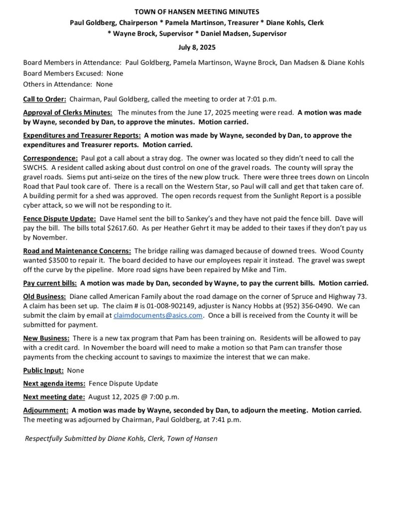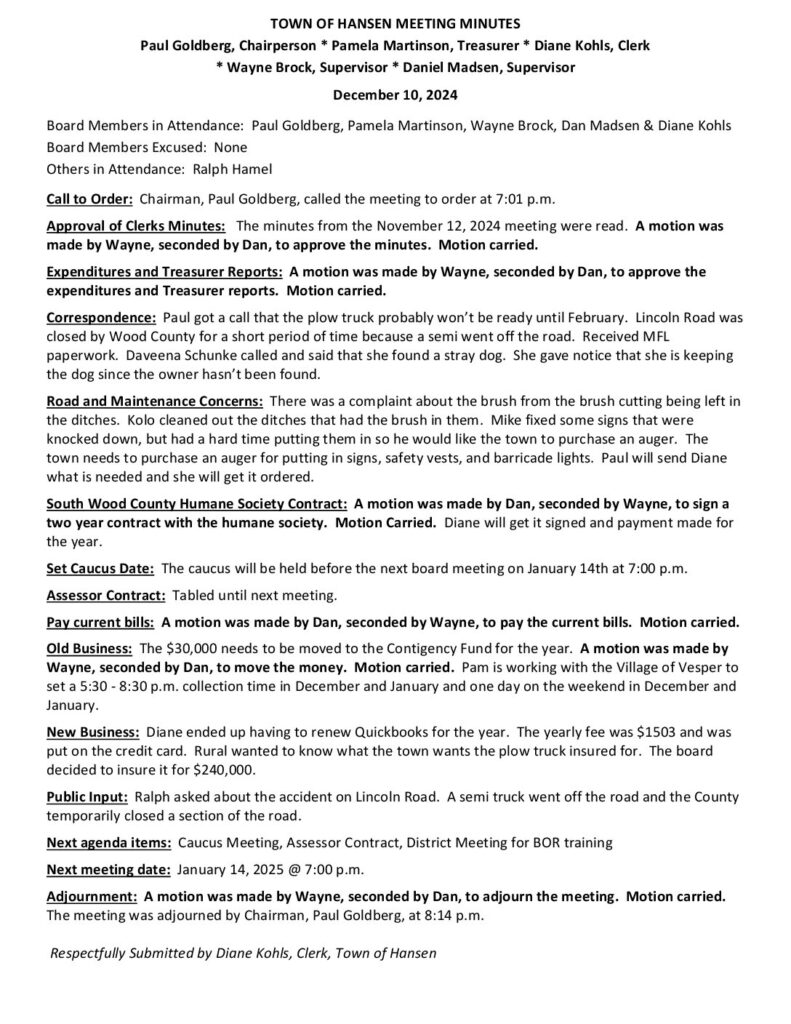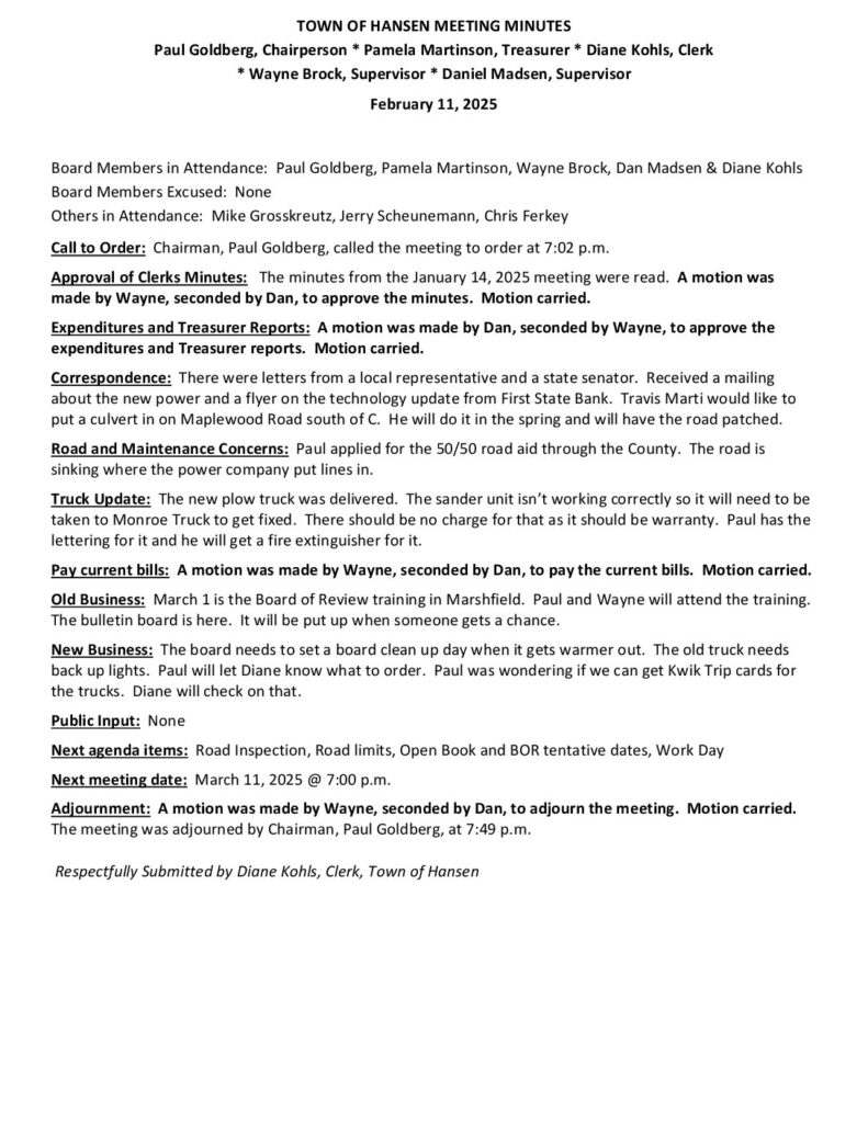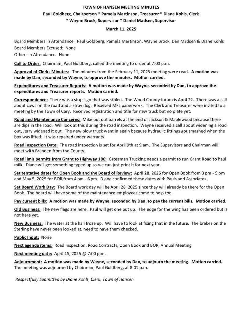 Respectfully Submitted by Diane Kohls, Clerk, Town of Hansen