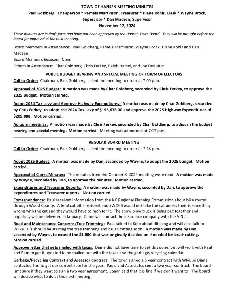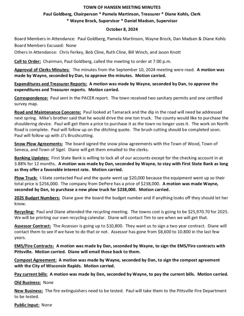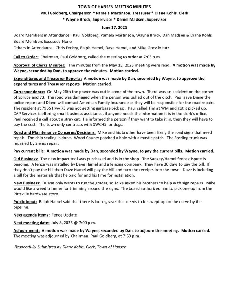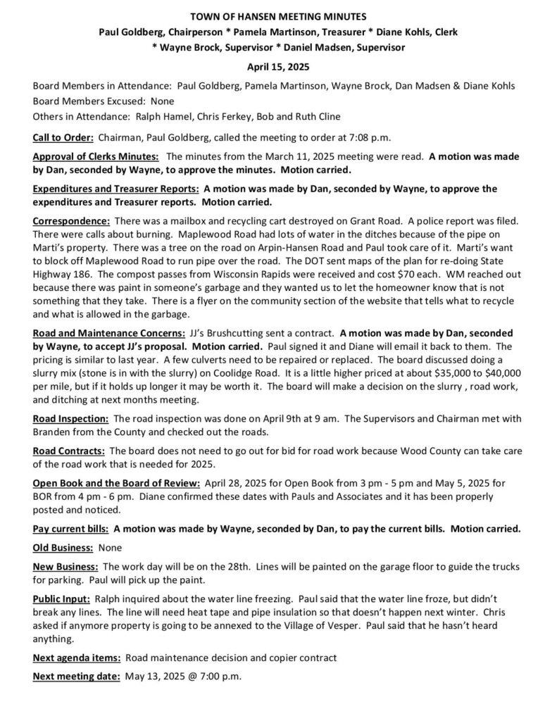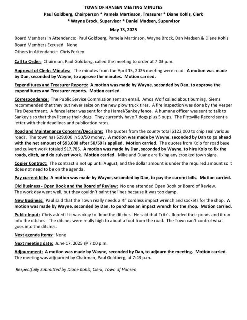 Respectfully Submitted by Diane Kohls, Clerk, Town of Hansen