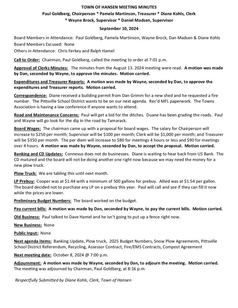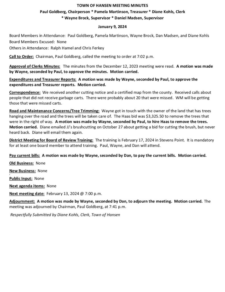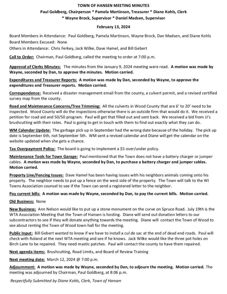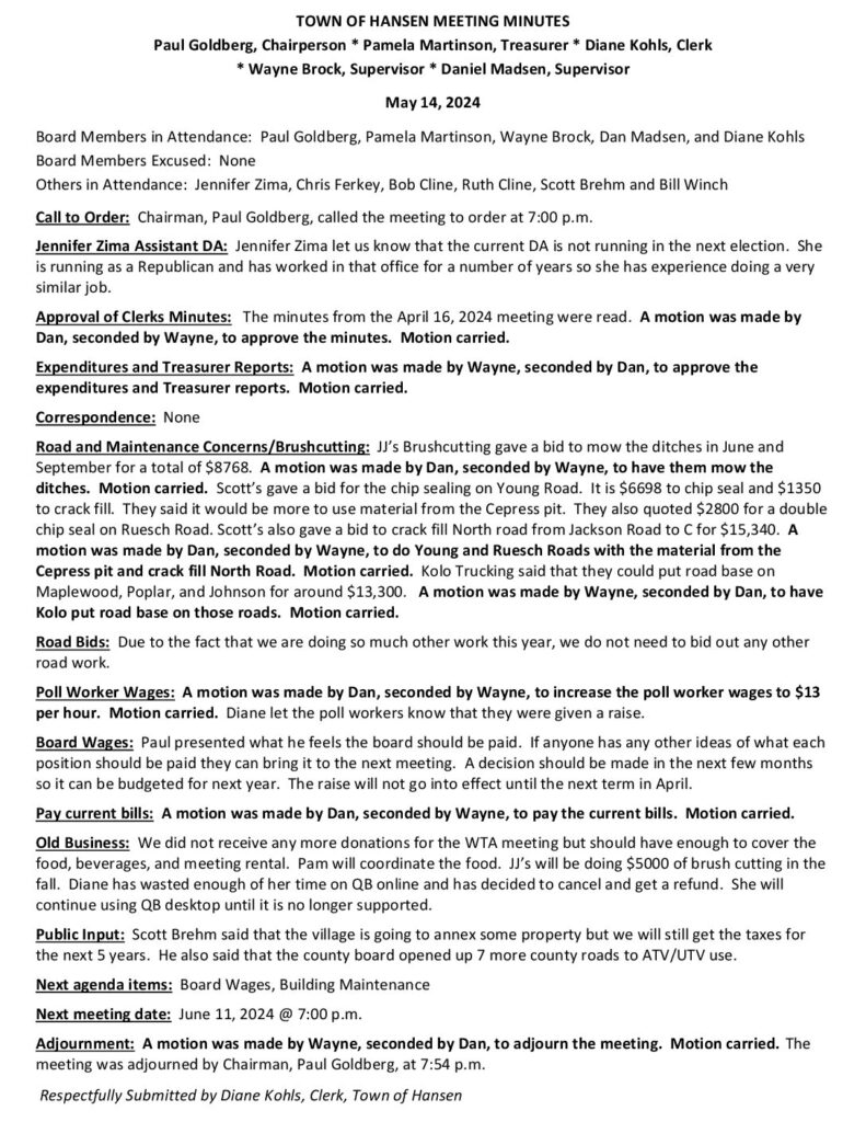 Respectfully Submitted by Diane Kohls, Clerk, Town of Hansen
