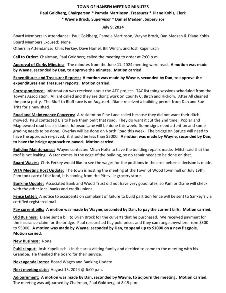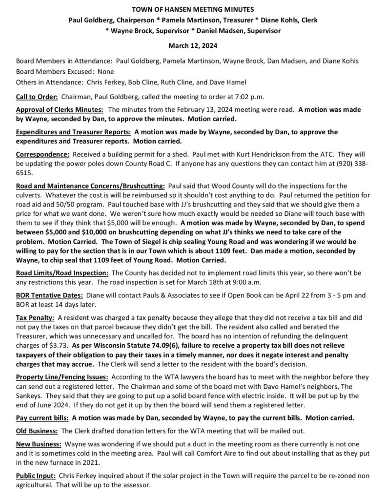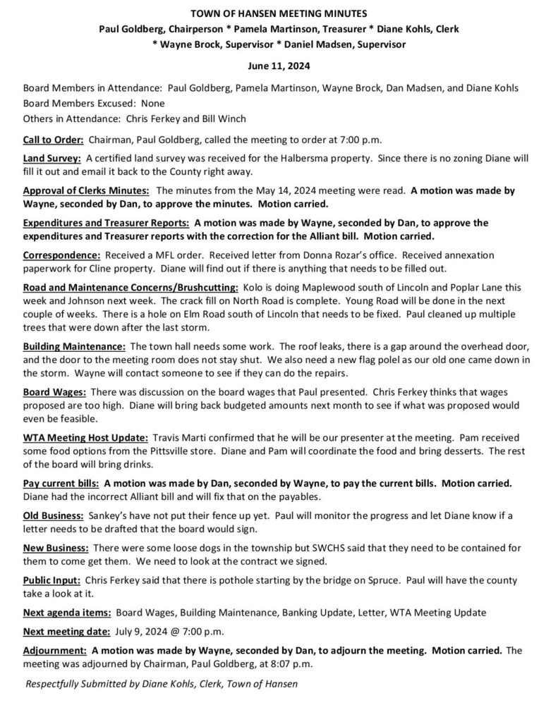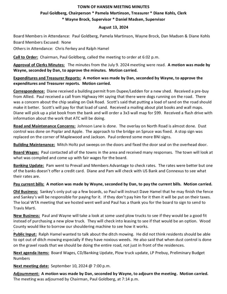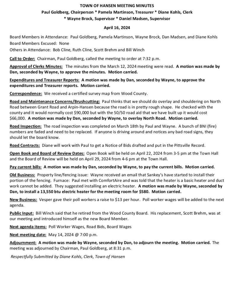 Respectfully Submitted by Diane Kohls, Clerk, Town of Hansen