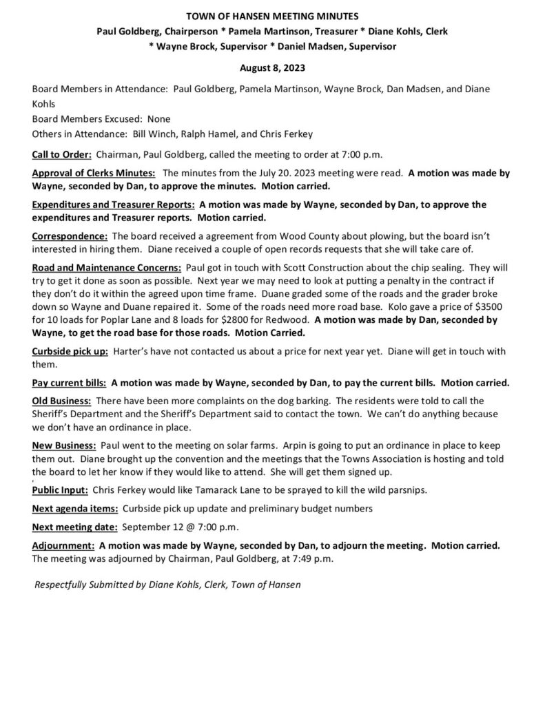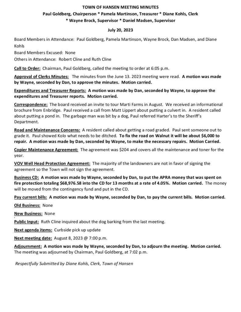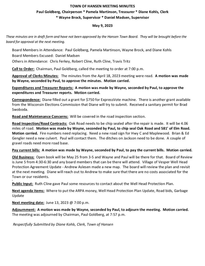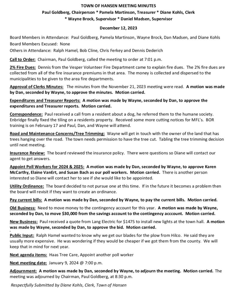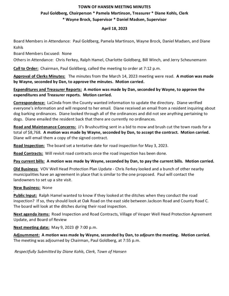 Respectfully Submitted by Diane Kohls, Clerk, Town of Hansen