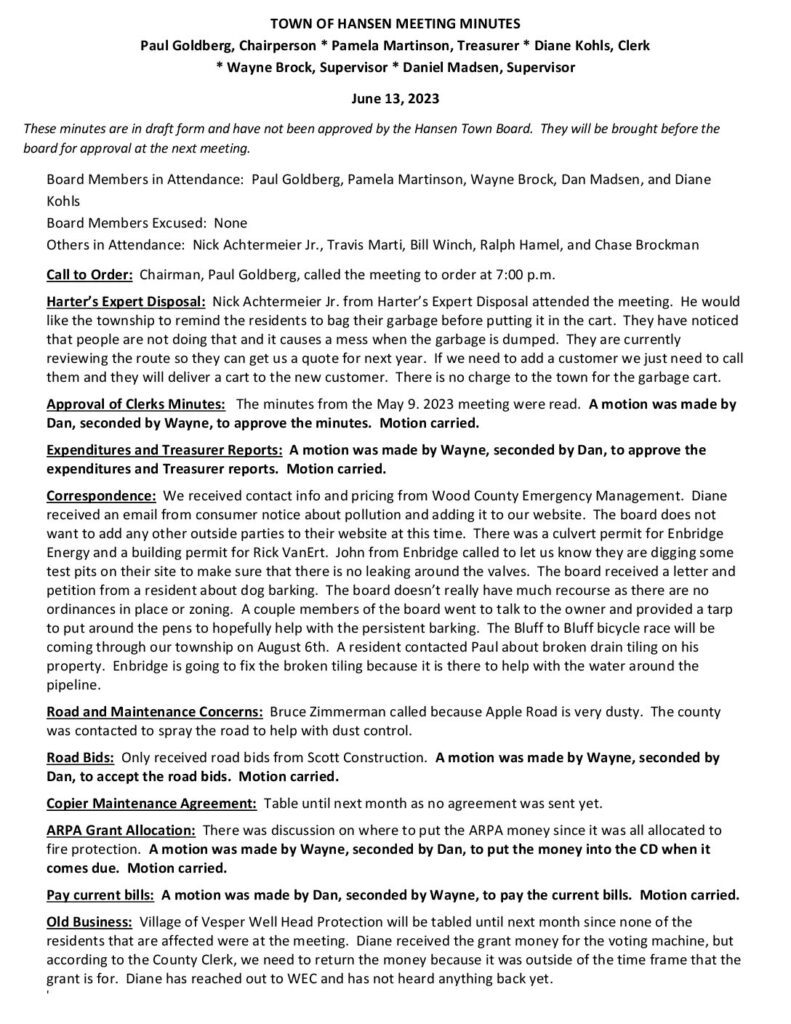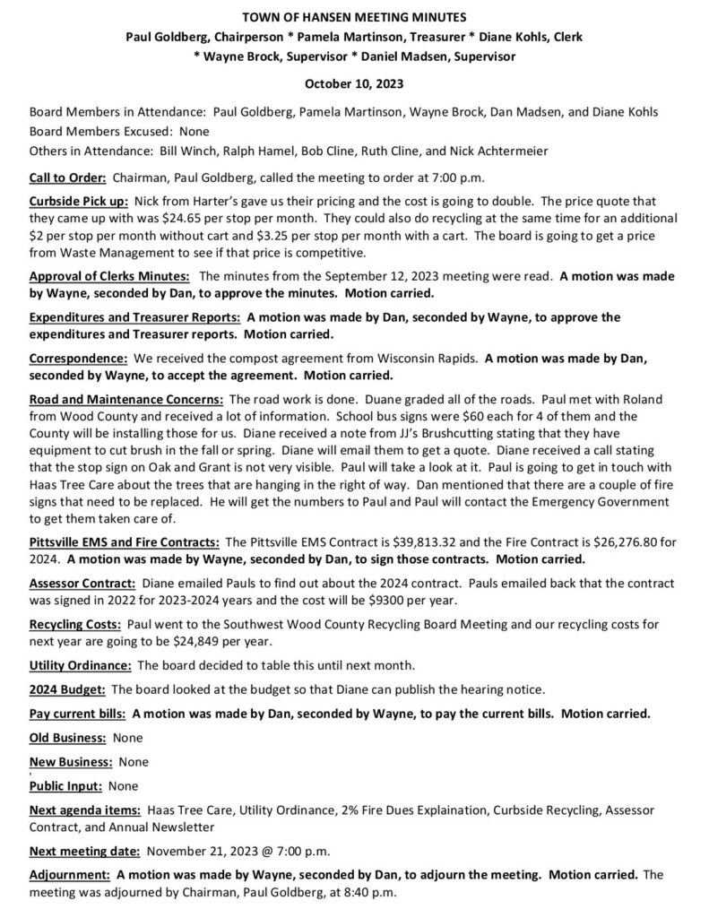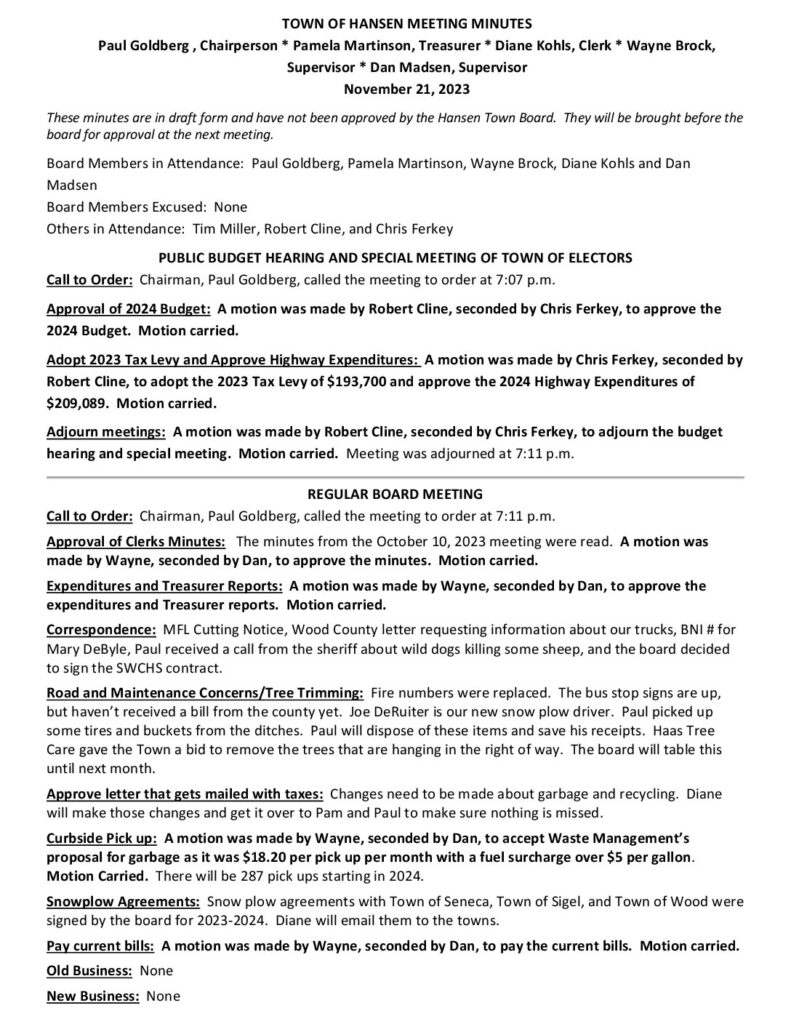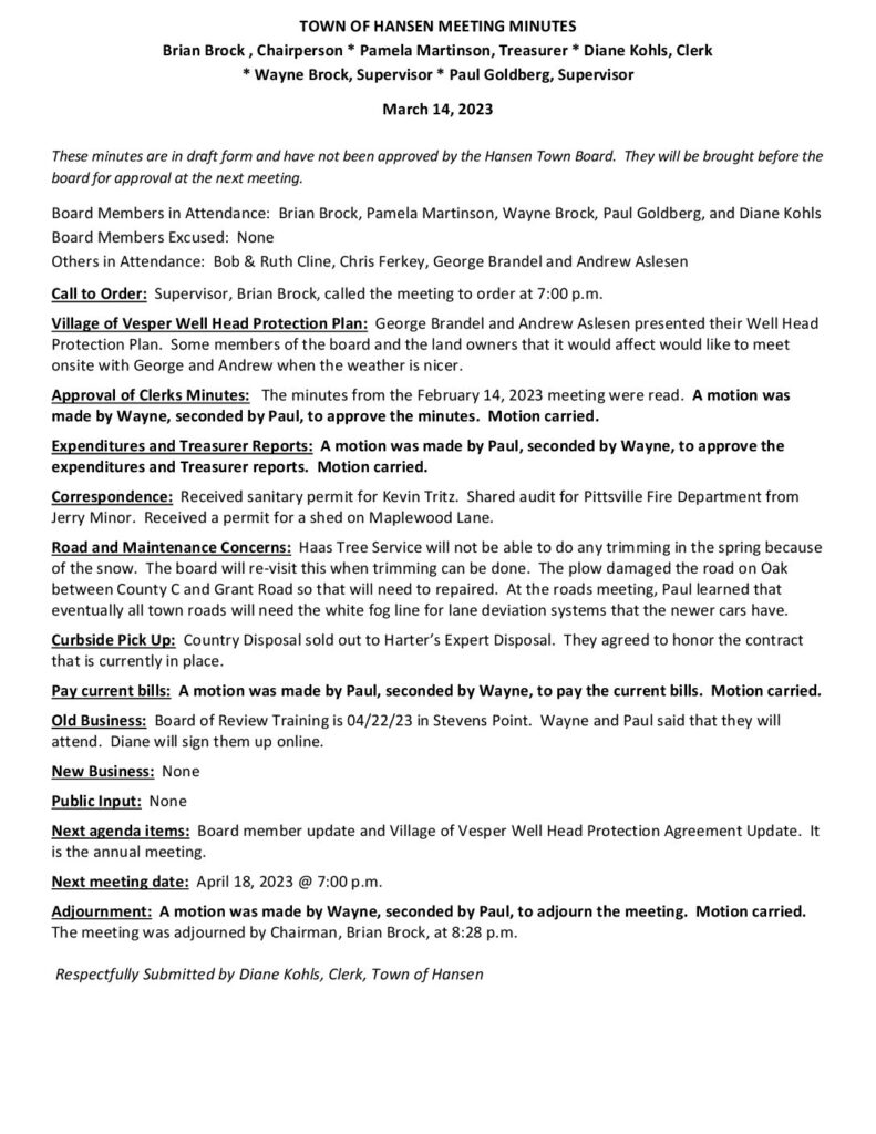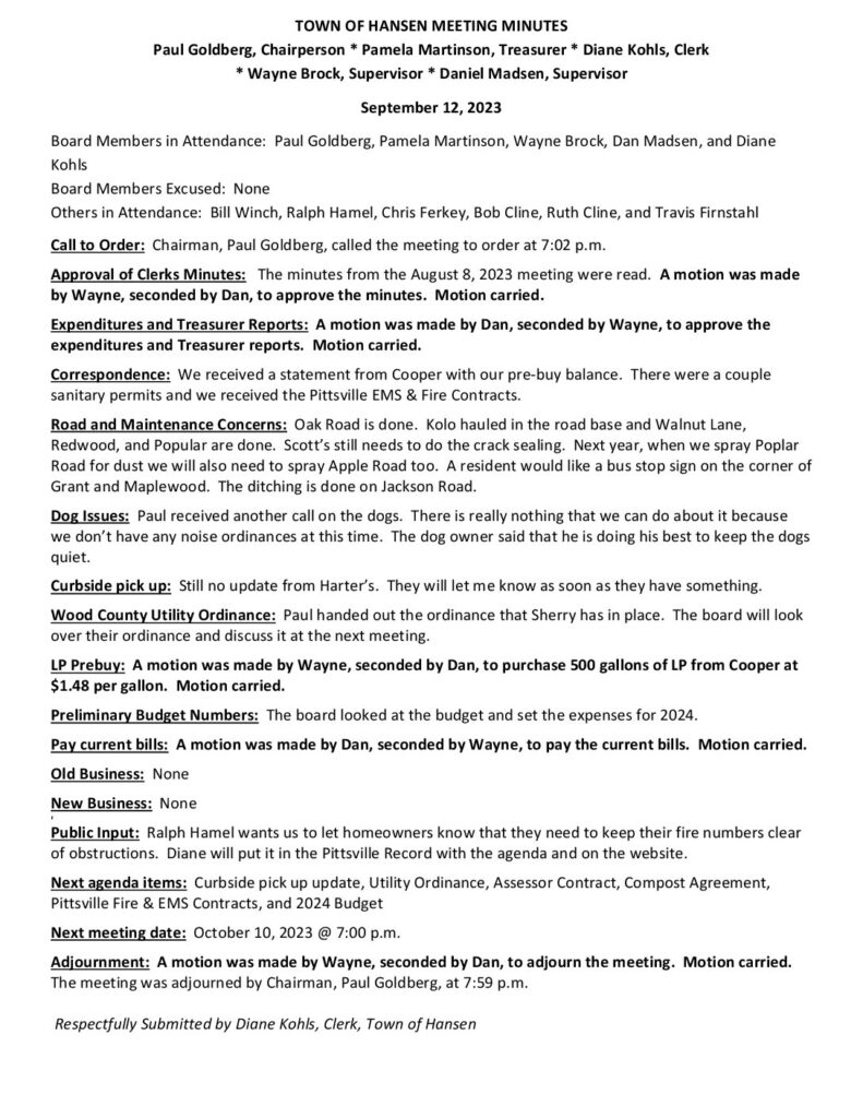 Respectfully Submitted by Diane Kohls, Clerk, Town of Hansen