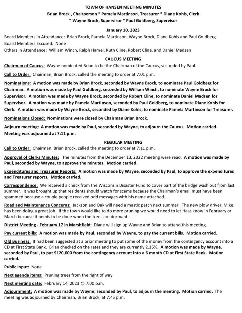Respectfully Submitted by Diane Kohls, Clerk, Town of Hansen