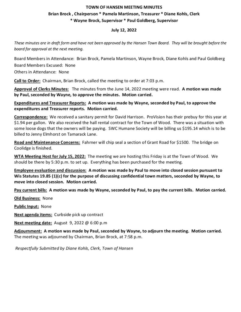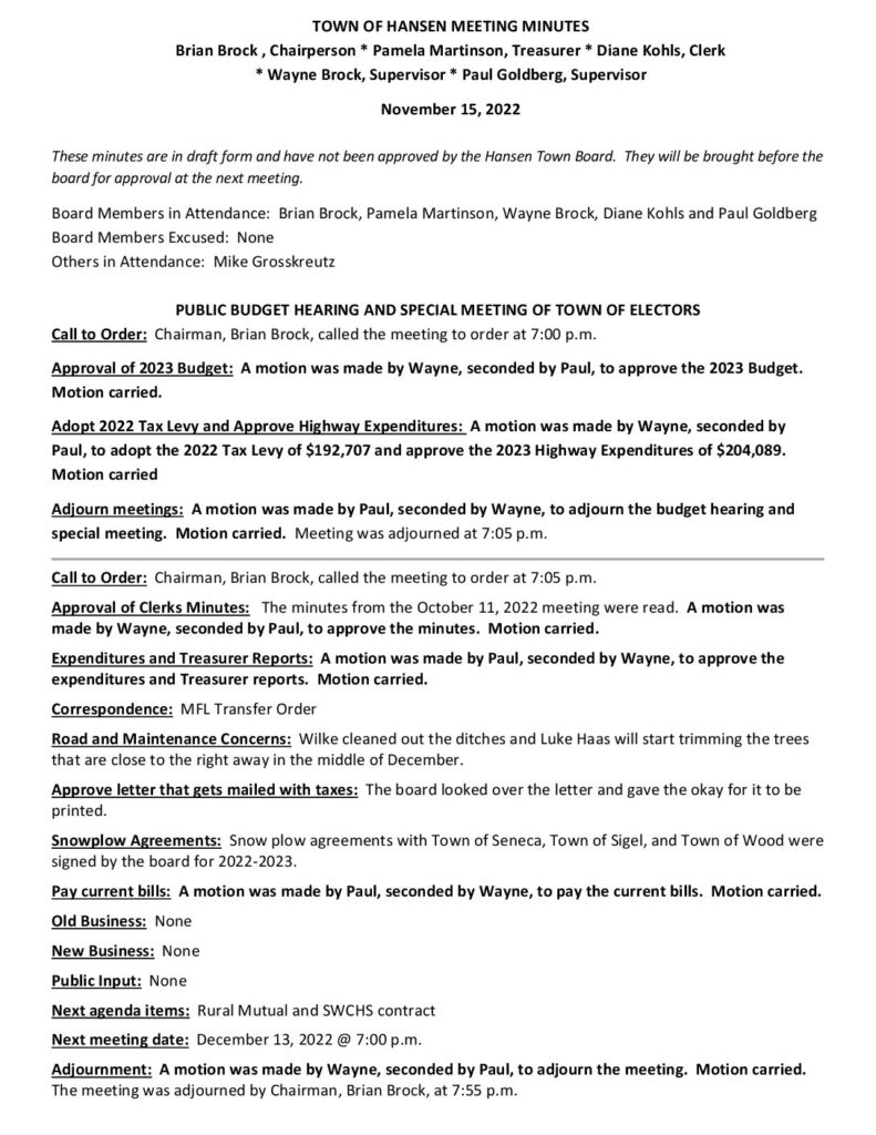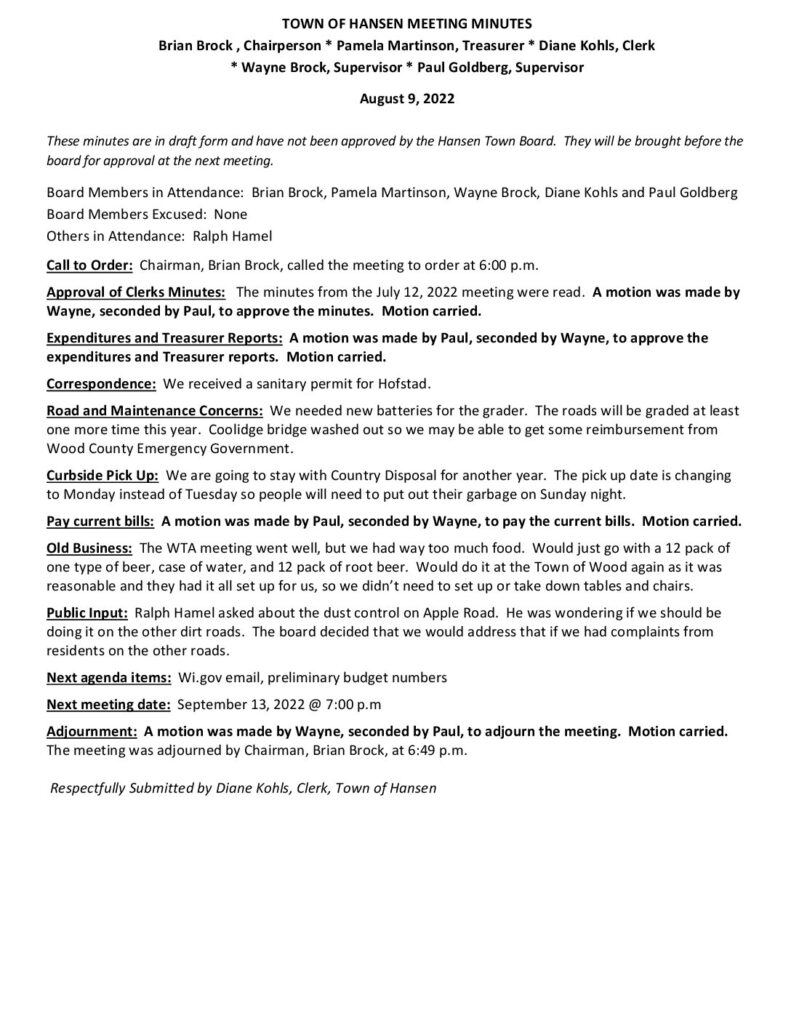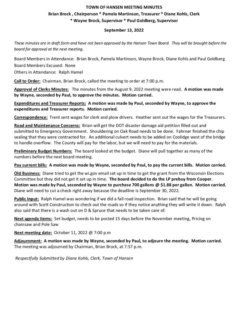 These minutes are in draft form and have not been approved by the Hansen Town Board. They will be brought before the board for approval at the next meeting.