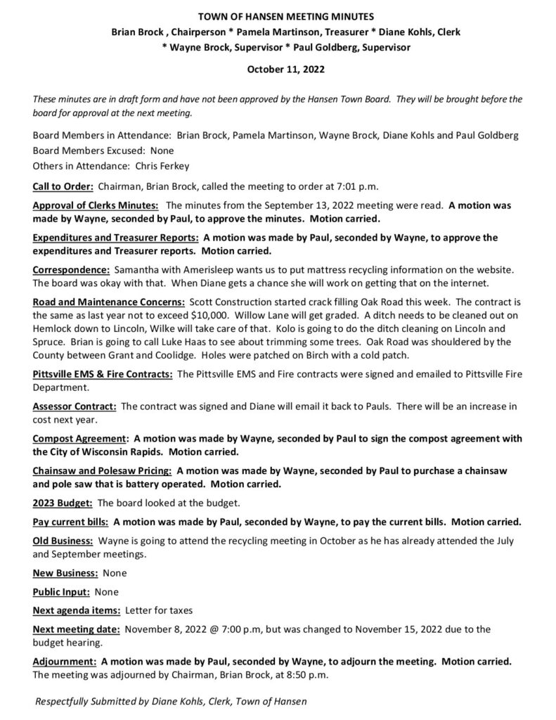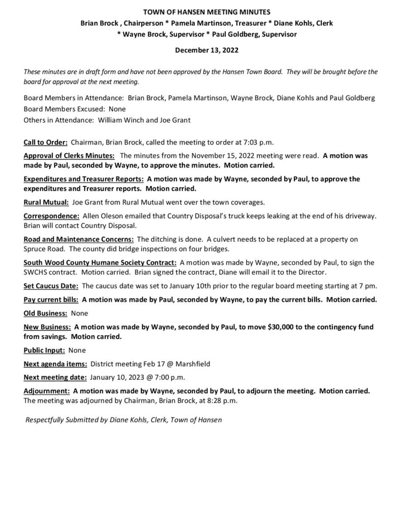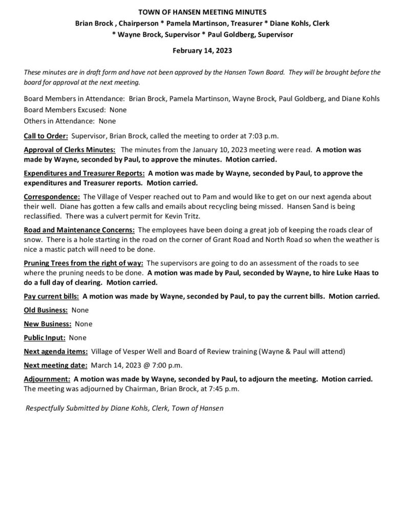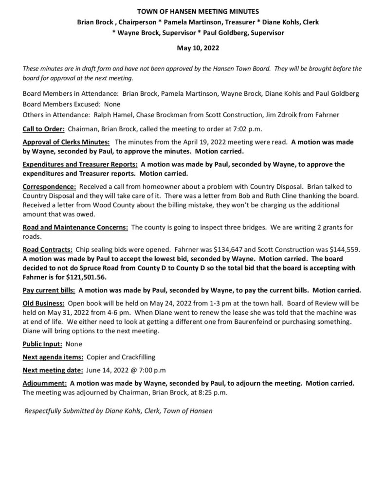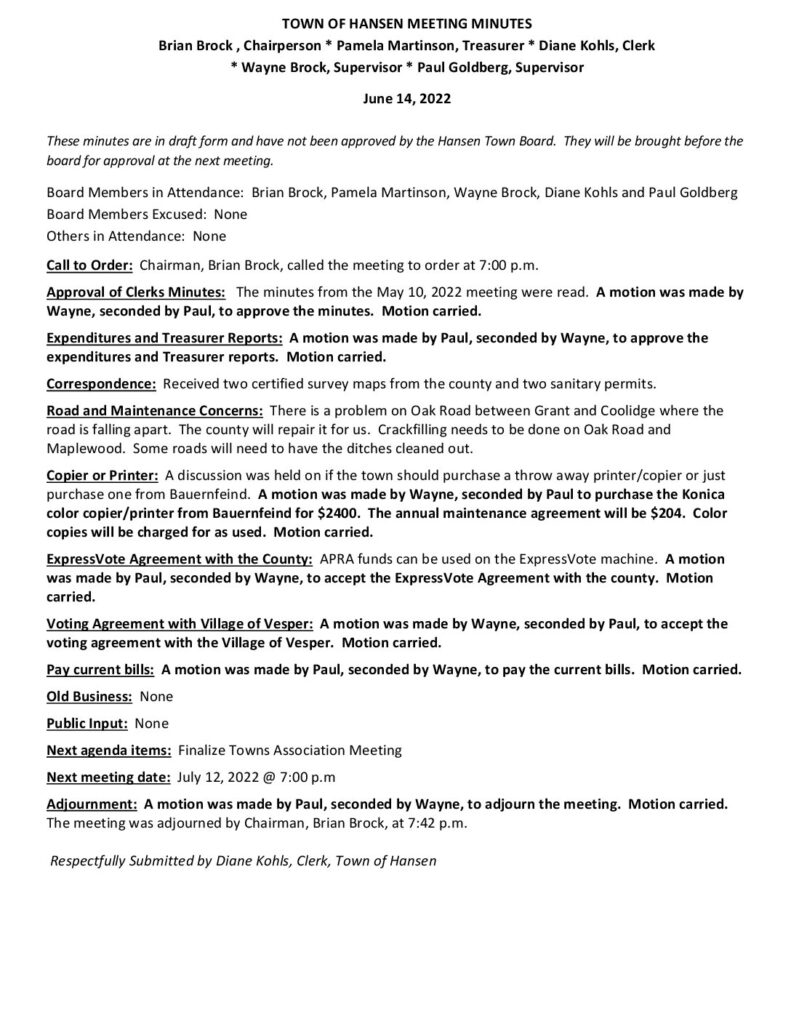 These minutes are in draft form and have not been approved by the Hansen Town Board. They will be brought before the board for approval at the next meeting.