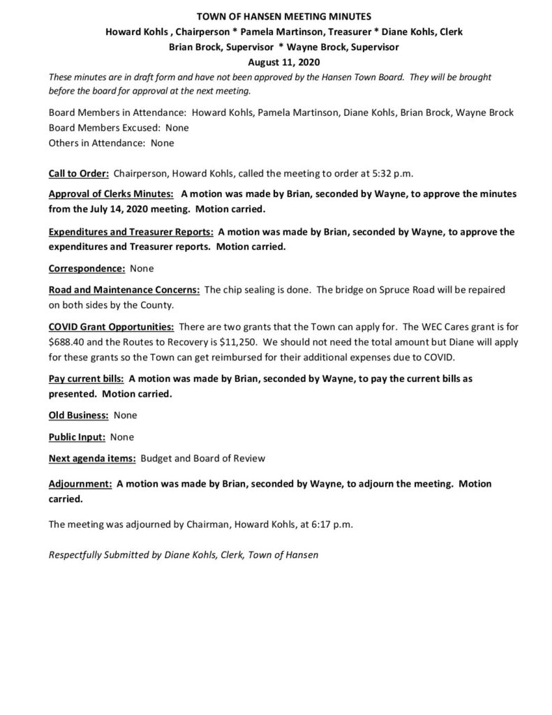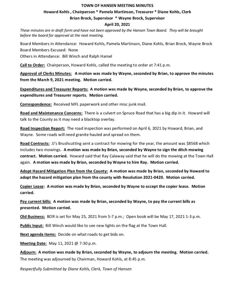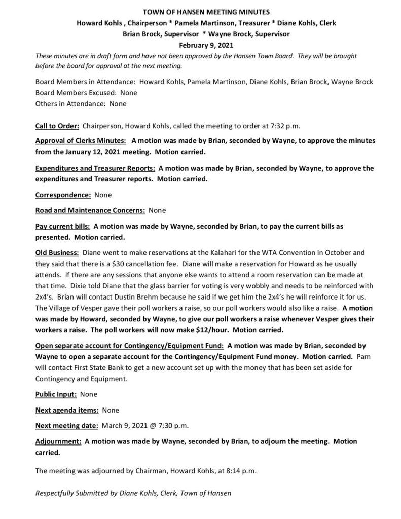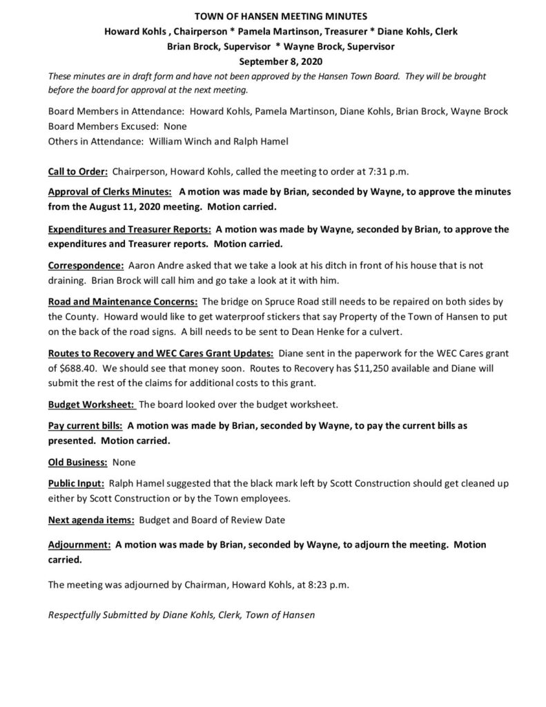 These minutes are in draft form and have not been approved by the Hansen Town Board. They will be brought before the board for approval at the next meeting.