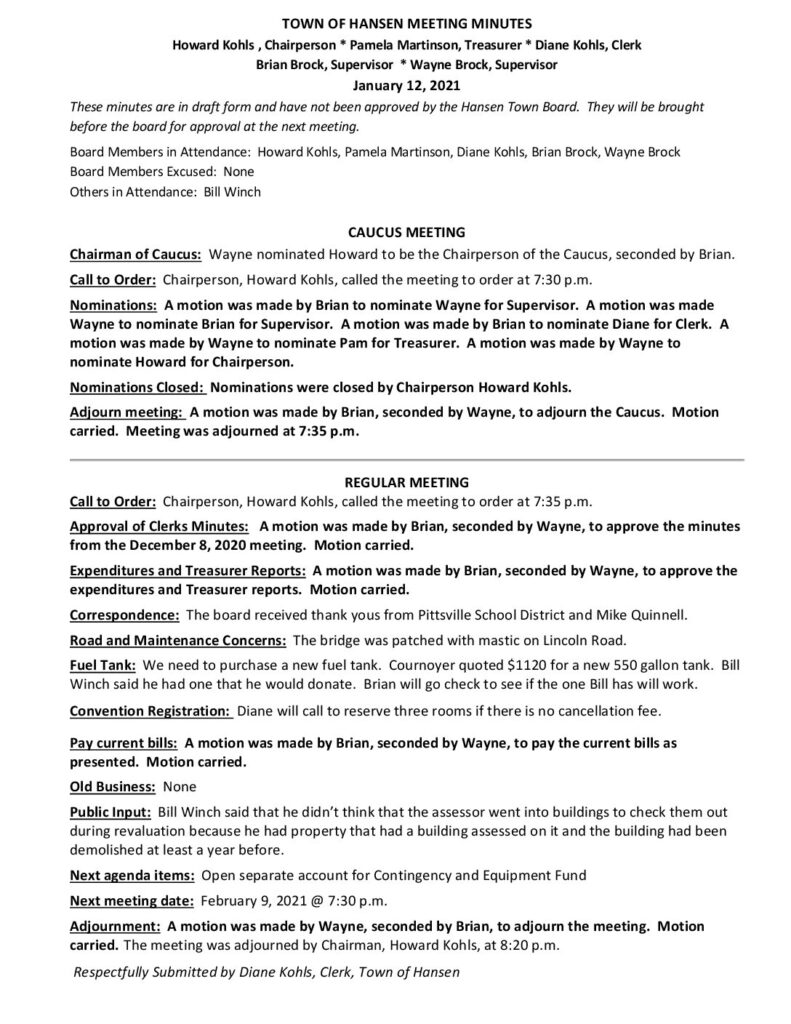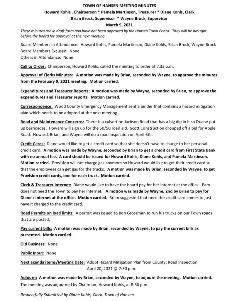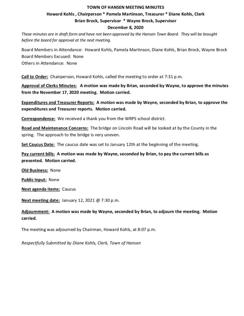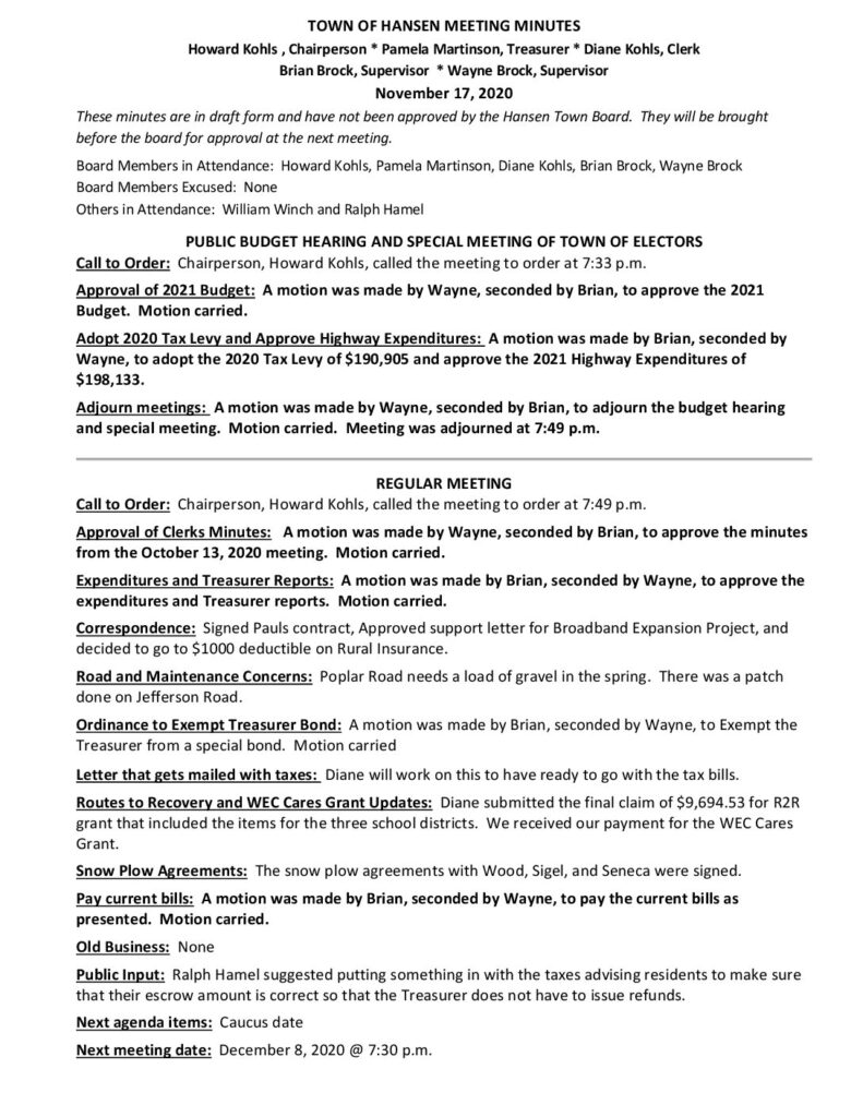 These minutes are in draft form and have not been approved by the Hansen Town Board. They will be brought before the board for approval at the next meeting.
