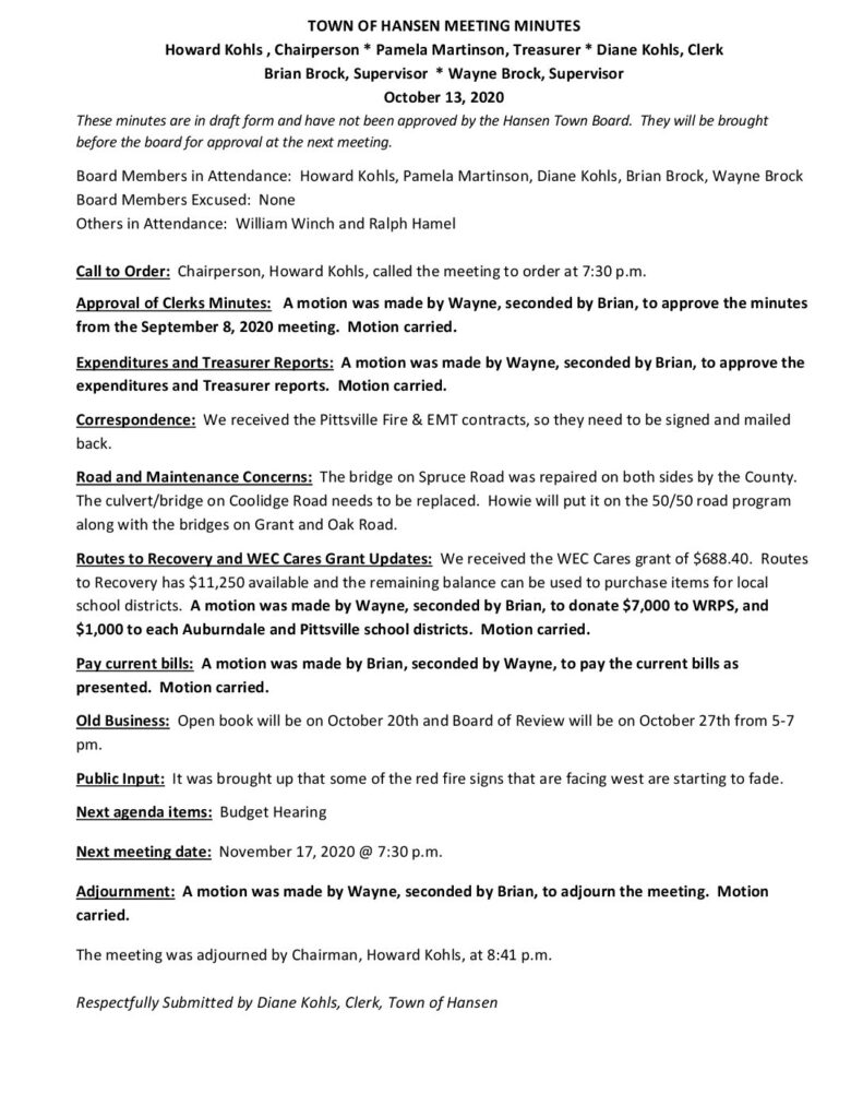 Respectfully Submitted by Diane Kohls, Clerk, Town of Hansen