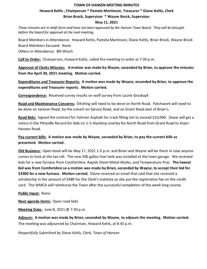 Old Business: Open book will be May 17, 2021 1-3 p.m. and Brian and Wayne will be there in case anyone comes to look at the tax roll. The new 500 gallon fuel tank was installed at the town garage. We received bids for a new furnace from ComfortAire, Rapids Sheet Metal Works, and Temperature Pros. The lowest bid was from ComfortAire so a motion was made by Brian, seconded by Wayne, to accept their bid for $3300 for a new furnace. Motion carried. Diane received an email that said that she received a scholarship in the amount of $489 for the Clerk’s Institute so she put the registration fee on the credit card. The WMCA will reimburse the Town after the successful completion of the week long course.
